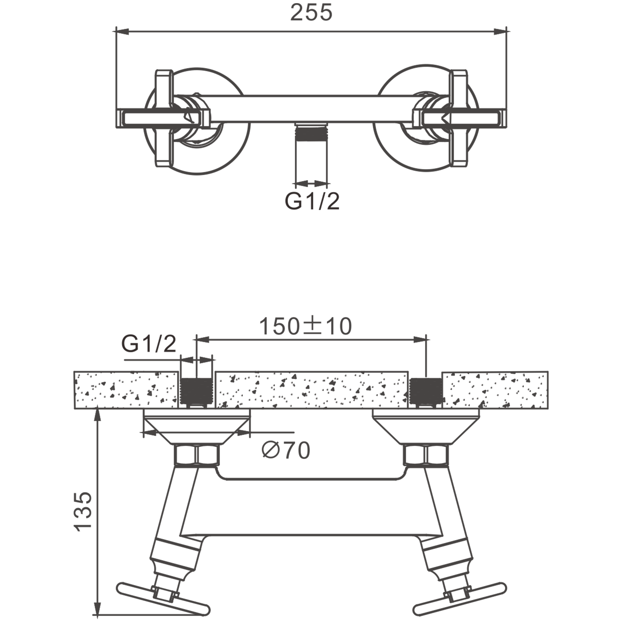 Смеситель изготовлен из латуни. Диаметр декоративных чашек 70 мм. Душевой гарнитур в комплекте. Межосевое расстояние (расстояние между выходом горячей и холодной трубы) 150 мм. Данное расстояние изменяется за счет входящих в комплект эксцентриков на 10 мм. в большую или меньшую стороны. Цвет хром.